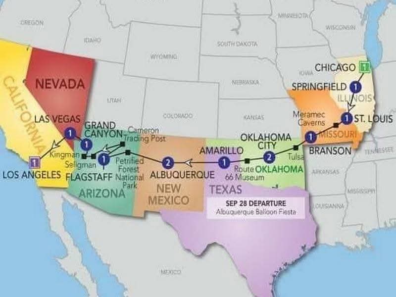 Putovanje prolazi kroz Illinois, Missouri, Kansas, Oklahoma, Texas, New Mexico, Arizona i California, uz prelazak kroz centralnu, planinsku i pacifičku vremensku zonu.
